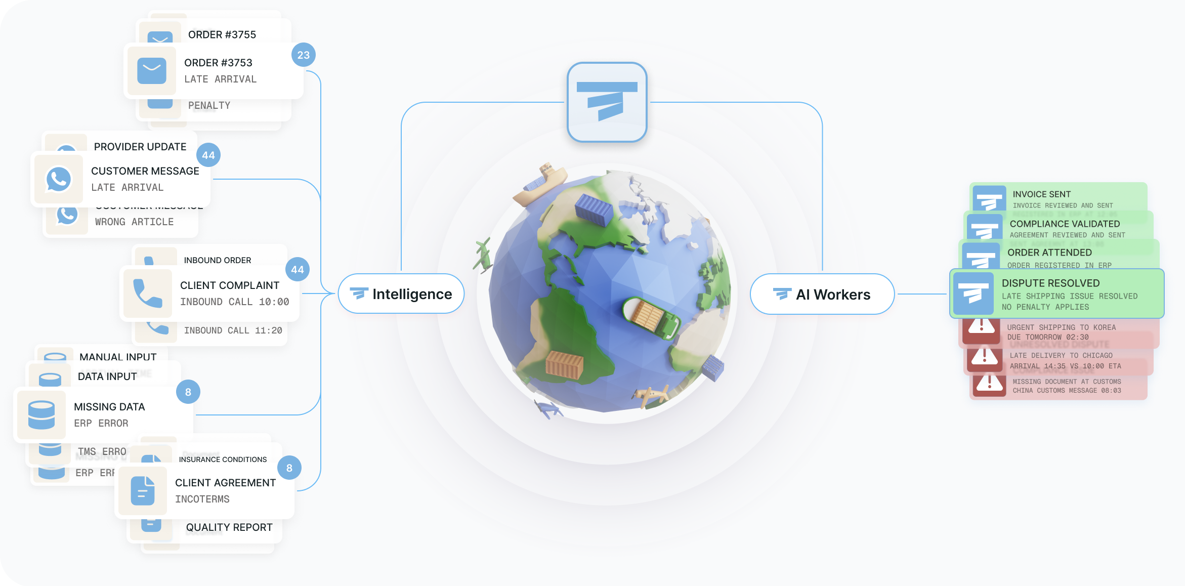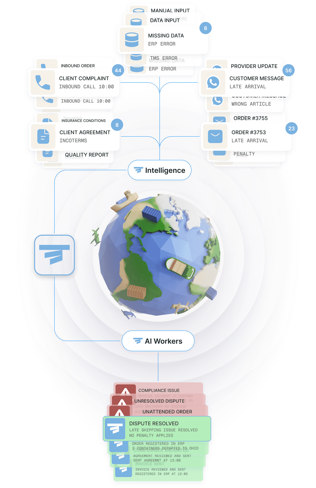Connect your ERP, TMS, WMS, Track & Trace, inboxes, and document repositories so your AI Workers can access the data they need and take action end-to-end. Just like your best operator.